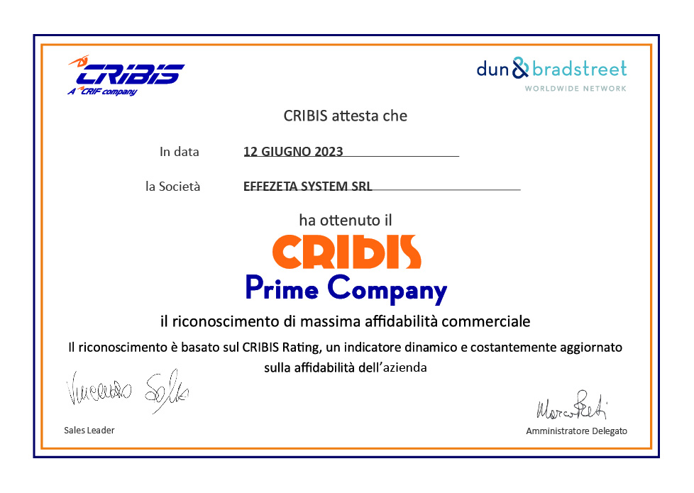 La Società Effezeta System Srl ha ottenuto il Cribis Prime Company 2023, il riconoscimento di massima affidabilità economico – commerciale che viene assegnato solo al 7% delle oltre 6 milioni di aziende in Italia.